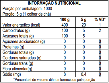 (*) % Valores Diários de referência com base em uma dieta de 2.000 kcal ou 8400 kJ. Seus valores diários podem ser maiores ou menores dependendo de suas necessidades energéticas. ** VD não estabelecido. |